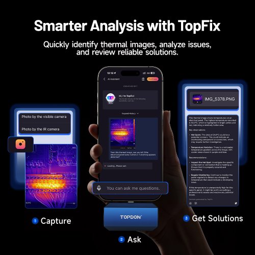Největší „game-changer“ u TOPDON TC001 Max je AI termální asistent TopFix. Umí pracovat s vašimi termálními snímky, rozumí dotazům k naměřeným výsledkům a vrací okamžitá doporučení, aby bylo snazší z termografie rychle udělat praktický závěr (kde je problém, co zkontrolovat, jak pokračovat).