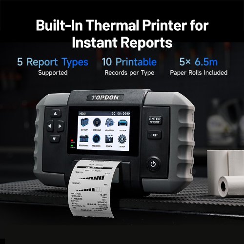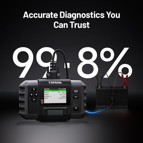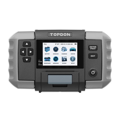 Klíčové vlastnosti: •Jednoduché a snadné použití •Testuje baterie ve vozidle a mimo něj •Přesné výsledky v několika sekundách •Analýza výdrže baterie •Přesné výsledky analýzy na displeji s možností tisku pro uchování naměřených dat •Uchování až 10 záznamů •Velký snadno čitelný LCD displej •Výsledky testů založené na CCA, BCI, CA, MCA, JIS, EN, DIN, SAE, GB a IEC normě •Test startovacího systému vozidla – doba startování, napětí a stav elektrického startovacího obvodu •Test nabíjecího systému vozidla – zátěžové napětí, napětí v nezatíženém stavu a stav nabíjecího systému