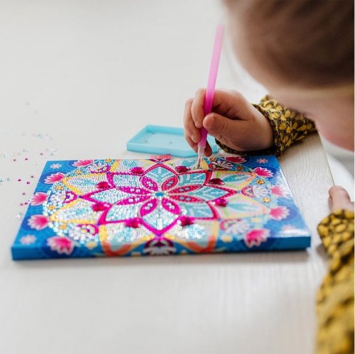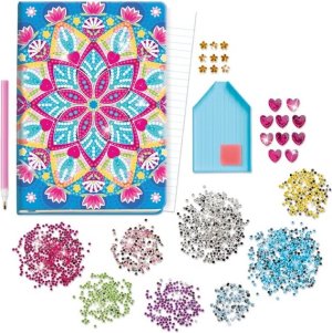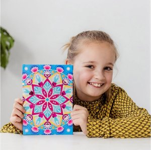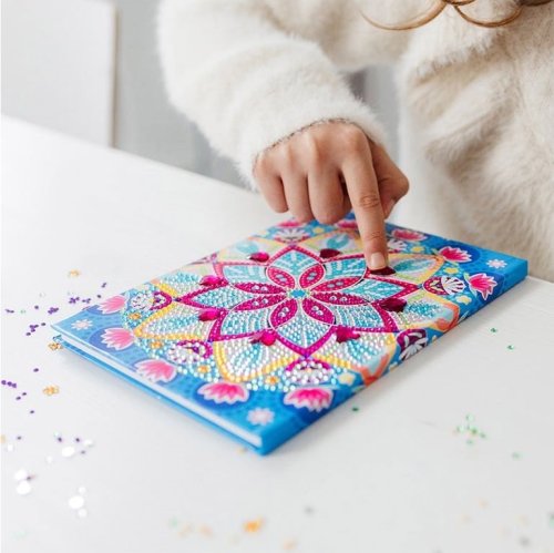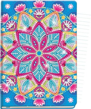 Blok A5 s tvrdými deskami s originální výzdobou pomocí barevných kamínků. Relaxace a třpytivý výsledek to v sobě snoubí diamantové obrázky. Postup: