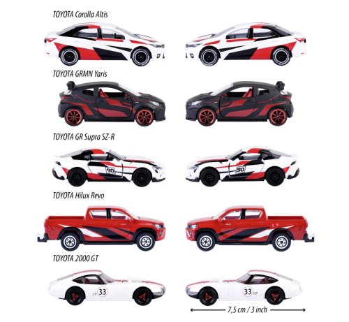 Dárková sada kovových autíček z kolekce Toyota Racing na volnoběh, otevírací části. Balení obsahuje 5 ks: Toyota GR Supra, Toyota GRMN Yaris, Toyota Hilux Revo, Toyota Corolla Altis, Toyota 2000 GT v barvě černé, bílé a červené. Délka autíčka 7,5 cm. V měřítku 1:64.