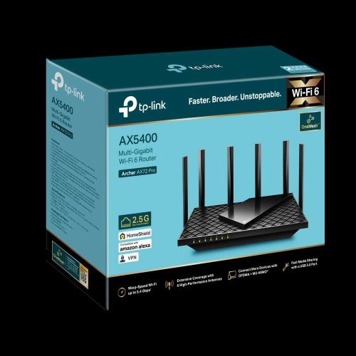 Archer AX72 Pro je Wi-Fi 6 Dual-Band router značky TP-Link, který obsahuje 4× 10/100/1000 Mbps LAN, 1× 10/100/1000/2500 Mbps WAN a 6 fixních antén. Bezdrátová část umí pracovat ve dvou pásmech zároveň a to rychlostí 574 Mbps ve 2,4 GHz pásmu a 4 804 Mbps v pásmu 5 GHz. Router podporuje IPv4 i nejnovější IPv6 routování. Router kromě nejvíce používaného modu AP Router podporuje i režim Access point.