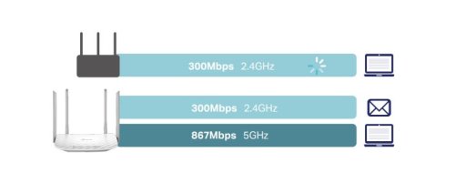 Router Archer C50 pracuje ve dvou pásmech 2,4 GHz a 5 GHz a zajišťuje tak skvělý zážitek při používání bezdrátové sítě. Souběžné využití obou pásem vám nabízí možnost flexibilně používat dvě samostatné sítě – jejichž šířky pásem se vzájemně podpoří, aby vše co potřebujete fungovalo hladce. Nenáročné úkoly, jako je posílání e-mailů nebo prohlížení internetu zvládne pásmo 2,4 GHz, zatímco aplikace, jež potřebují velkou šířku pásma, jako hraní online her nebo streamování HD videa, obslouží pásmo 5 GHz – vše současně.