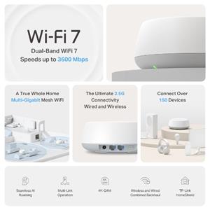 Bezdrátové Standardy *Wi-Fi 7 *IEEE 802.11be/ax/ac/n/a 5 GHz *IEEE 802.11be/ax/n/b/g 2,4 GHz Rychlost WiFi *BE3600 *5 GHz: 2882 Mbps (802.11be) *2,4 GHz: 688 Mbps (802.11be) Pracovní režimy * Režim routeru * Režim přístupového bodu Pokročilé funkce * Provoz s více linkami (MLO) *160 MHz kanál *4K-QAM *Více RU *Funguje s Alexou a Google Assistant