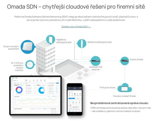 - integrace do Omada SDN - funkce Zero-Touch Provisioning (ZTP), centralizovaná cloudová správa, inteligentní monitoring (Omada Mesh, Seamless Roaming, Cloud Access a Captive Portal vyžadují použití kontrolerů Omada SDN)