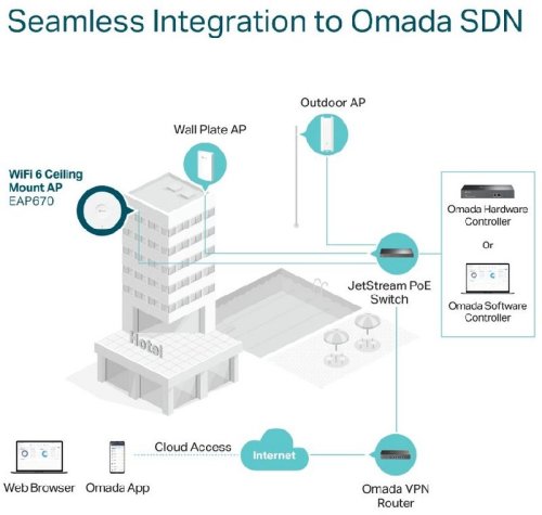 EAP670 je bezdrátový Access Point od značky TP-Link, z rodiny EAP a je určen pro vnitřní použití s montáží na strop či stěnu. Dual-bandový AP s podporou WiFi standardů 802.11a/b/g/n/ac/ax (Wi-Fi 6) je 2×2 MIMO v pásmu 2.4 GHz a 4×4 MIMO v pásmu 5 GHz s modulačními rychlostmi 574 + 4804 Mbps, čtyřmi vestavěnými anténami se ziskem 4 dBi a 5 dBi, podporou šířky kanálu až 160 MHz a funkcí jako MU-MIMO, OFDMA a šifrování pomocí WPA3.