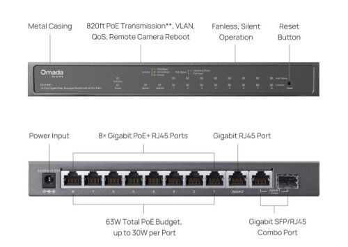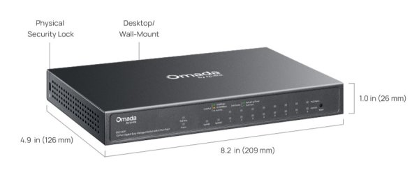 Hardwarové parametry: *Rozhraní: 8× 10/100/1000 Mbps PoE+ RJ45 porty (podpora 802.3af PoE a 802.3at PoE+) 1× 10/100/1000 Mbps RJ45 port 1× Gigabit SFP/RJ45 kombinovaný port Auto-Negotiation/Auto MDI/MDIX *Počet ventilátorů: Bez ventilátorů *Instalace: stolní, na zeď *Fyzický bezpečnostní zámek: Ano *Napájení: Napájecí adaptér stejnosměrného proudu (výstup: 53,5 V DC / 1,31 A) *Rozměry (Š × H × V): 8,2 × 4,9 × 1,0 palce (209 × 126 × 26 mm) *Ochrana proti přepětí: ±6 kV