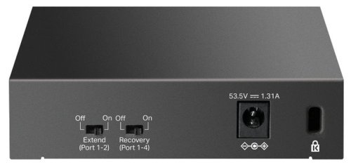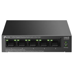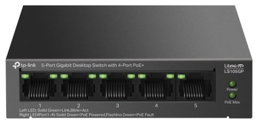TP-Link PoE Switch LS105GP je nemanagovatelný gigabitový PoE Switch s 5x 10/100/1000Mbps LAN porty z čehož na 4 portech podporuje PoE 802.3af/at až 30W/port. Celkový PoE budget switche je 65W. Switch umožňuje i PoE na vzdálenost 250m při přepnutí speciálního přepínače, který způsobí ponížení linkové rychlosti na PoE portech na 10Mbps, což pro přenos obrazu z kamer bohatě stačí. Další funkcí je PoE auto recovery, která automaticky restartuje nereagující zařízení napájená pomocí PoE.