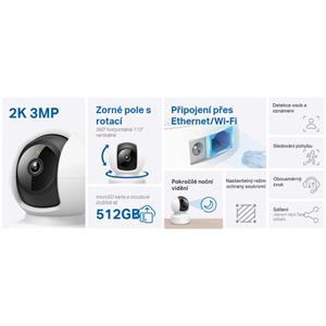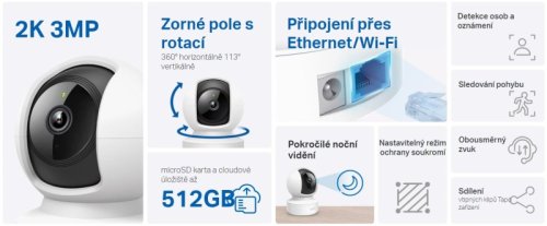 Obousměrný zvuk Hlasové ovládání (funguje s Google Assistant a Alexa) Místní úložiště prostřednictvím microSD karty ( Až 512 GB) Tapo App Night Vision (až 9 m) Frustration-Free Setup (FFS)