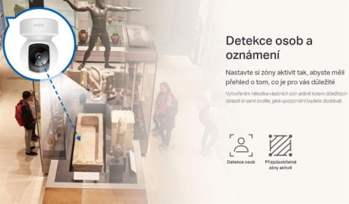 Pan/Tilt Inteligentní detekce AI a upozornění (pohyb, lidé) Sledování pohybu Zvukový a světelnýalarm Dálkové ovládání