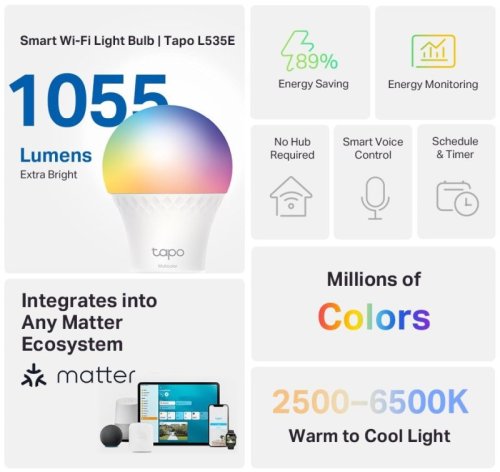 Tapo L535E je stmívatelná žárovka s paticí E27 disponující 16 miliony barvami a chytrými funkcemi. Díky světelnému toku 1055 lm a vyzařovacímu úhlu 220° dokáže nahradit klasickou žárovku s příkonem 75W a to se spotřebou pouhých 8.6 W! Udávaná životnost žárovky činí 25 000 hodin. Kromě standardního bílého světla o teplotě 2500-6500K dokáže žárovka svítit různými barvami díky diodám RGB.