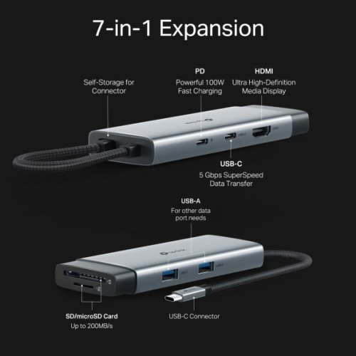Rozšiřte možnosti vašeho zařízení s multifunkčním USB-C hubem TP-Link UH7020C. Tento univerzální 7v1 hub transformuje jediný port USB-C na kompletní sadu připojení, která vyhoví všem vašim potřebám. S podporou HDMI 4K@60Hz, čtečkou paměťových karet, výkonným nabíjením 100W a rychlým přenosem dat 5 Gb/s získáte vše, co potřebujete pro efektivní práci i zábavu.