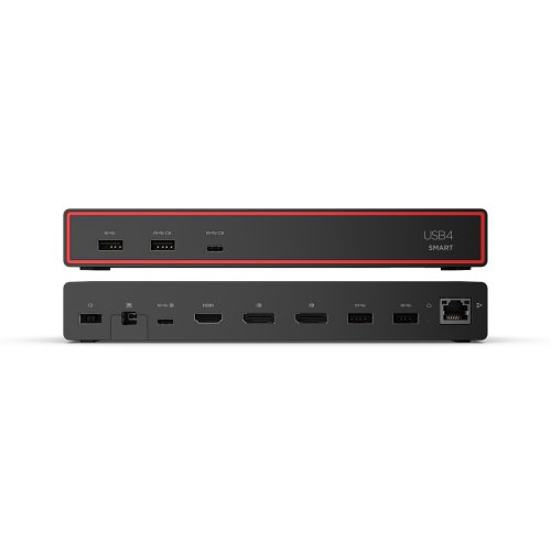 LENOVO dokovací stanice ThinkPad USB4 Smart Dock 5500 - 135W adaptér (100W PD) Lenovo ThinkPad USB4 Smart Dock 5500, navržený pro zvýšení každodenní produktivity, je špičkou v nové řadě USB doků a nabízí chytřejší způsob práce. Díky zcela novému softwaru Lenovo Accessories Fleet Manager (LAFM) od AWS for IT Manager má dokovací stanice šířku pásma 40 Gb/s s připojením k notebooku přes USB4, což vám umožní rozšířit sestavu monitoru o více pixelů a vyšší obnovovací frekvence.