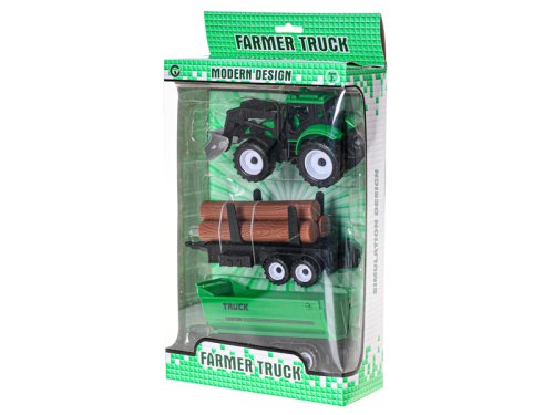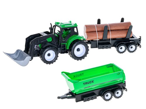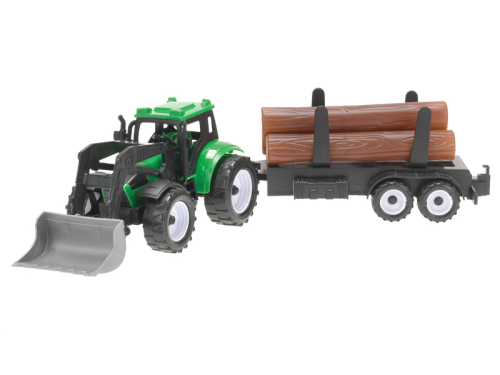 Traktor s vlečkou o velikosti 38cm má přední lžíci k nakládání a dvě vyměnitelné vlečky. Traktor je na setravčník. K dostání je ve dvou barevných variantách.
