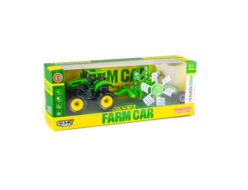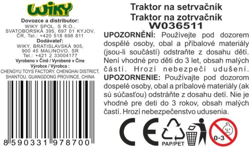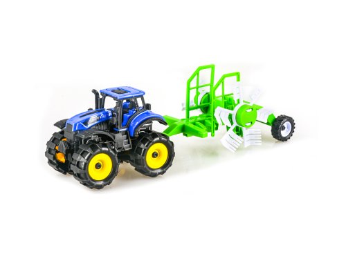 Traktor na setrvačník s přívěsem. Rozměry traktoru 25x7x7,5 cm. 2 varianty - modrá, zelená.
