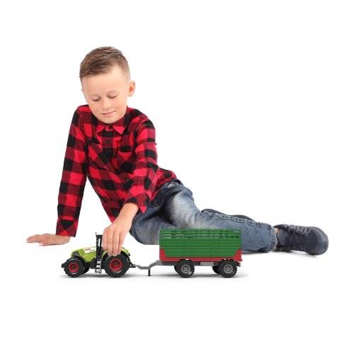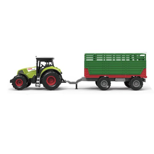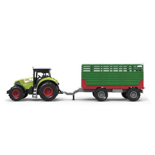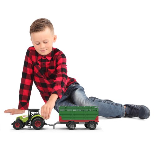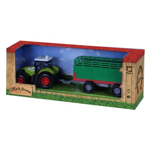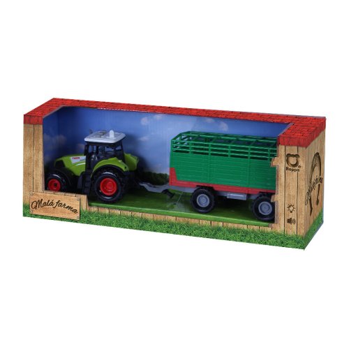 Moderní plastový traktor s vlečkou na seno, hračka z kolekce Moje malá farma. Nepostradatelný pomocník pro každého malého farmáře! Vlečku můžeš jednoduše odpojit a traktor využít k dalším pracím. Traktor jezdí na setrvačník a jeho délka včetně přívěsu je 37 cm. Zmáčknutím tlačítek traktor vydává reálné zvuky. Traktor vyžaduje 3 ks baterií typu AG13/LR44, které jsou součástí balení.