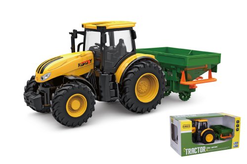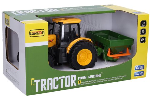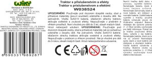 Traktor s příslušenstvím. Rozměry 27,5x11,5x12 cm. Na setrvačník. Světelné a zvukové efekty. 3xAG13 baterie součástí.
