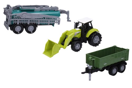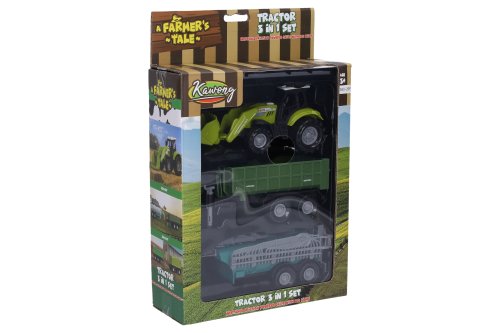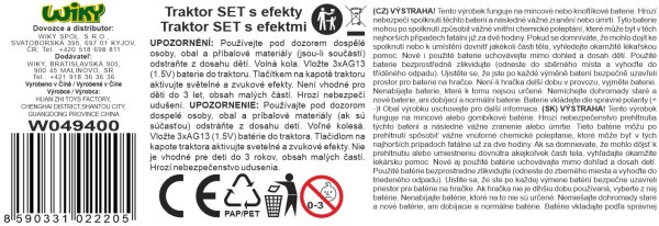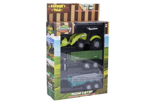 Traktor s příslušenstvím a efekty. Velikost traktoru 17 cm, vlečka 15 cm. Volná kola. Světelné a zvukové efekty tlačítkem na kapotě. 3xAG13 baterie součástí.