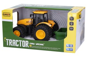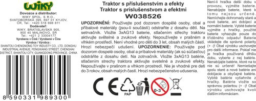 Traktor s příslušenstvím. Rozměry 27,5x10,5x12 cm. Dvojitá kola. Na setrvačník. Světelné a zvukové efekty. 3xAG13 baterie součástí.