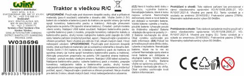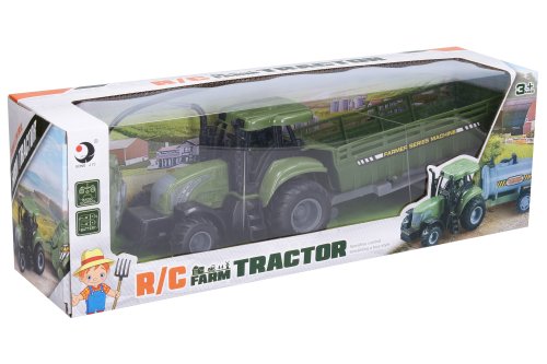 Traktor s vlečkou RC na dálkové ovládání. Rozměry 37x9x10 cm. Frekvence 27 MHz. 3.7V bateriový pack do traktoru součástí, 2xAA do ovladače nejsou součástí. USB kabel součástí. Tlačítko ON/OFF na spodní straně traktoru.