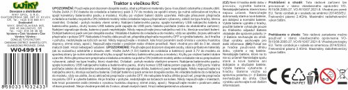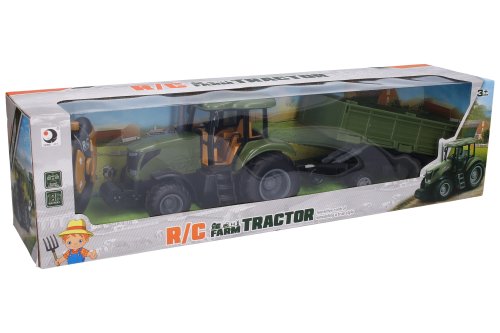 Traktor s vlečkou RC na dálkové ovládání. Velikost 40 cm, velikost traktoru 24 cm. Frekvence 2.4GHz. Bateriový pack 3.7V do traktoru součástí, 2xAA do ovladače nejsou součástí. USB kabel součástí. Přepínač ON/OFF na spodní straně traktoru.