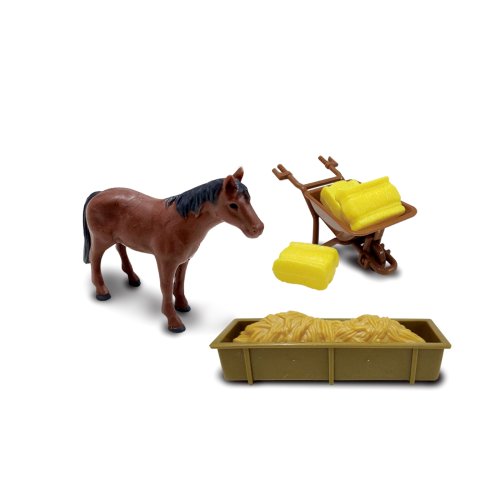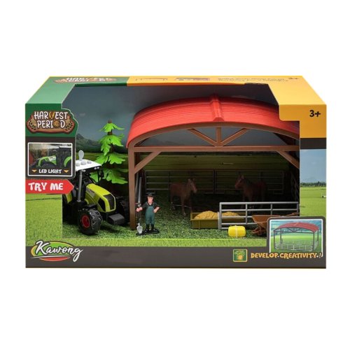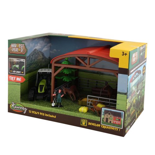 Co takhle si postavit vlastní výběh s ohradou pro koně? S touto sadou máš ideální příležitost. K postavení tvé malé farmy dostaneš oplocení, přístřešek pro koně, seno, traktor a také farmáře, který se ti bude strat o tvou farmu. V balení najdeš samozřejmě postavičky koně a další doplňky. Stlačením některého ze tří tlačítek na střeše traktoru vydává reálný zvuk spolu se světelným efektem. Traktor jezdí na setrvačník obsahuje 3 ks baterií typu AG13/LR44.