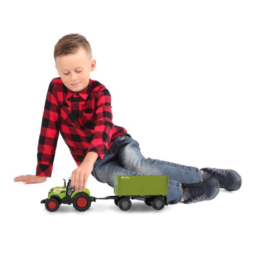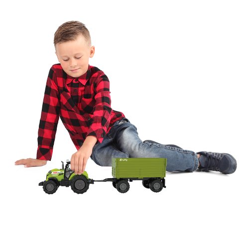 Moderní plastový farmářský traktor s vlečkou, hračka z kolekce Moje malá farma. Vlečka se dá jednoduše odpojit a otevřít. Traktor jezdí na volný chod a jeho délka je 10 cm. Přívěs je v délce 11 cm, celková délka včetně přívěsu je 25 cm. Zmáčknutím tlačítka na traktoru vydává reálné zvuky spolu se světelným efektem. Traktor vyžaduje 3 ks baterií typu AG13/LR44, které jsou součástí balení.