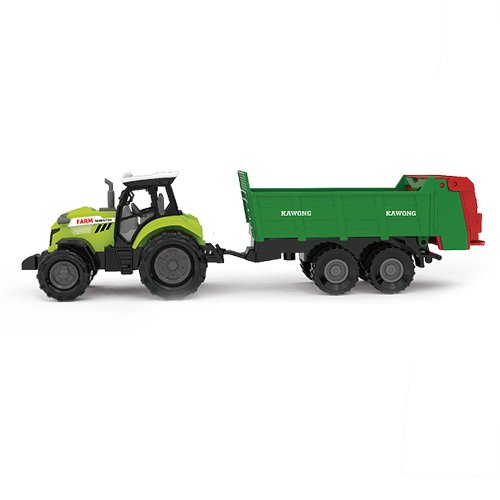 Moderní plastový farmářský traktor s vlečkou, hračka z kolekce Moje malá farma. Vlečka se dá jednoduše odpojit, sklopit a otevřít. Traktor jezdí na volný chod a jeho délka je 10 cm. Přívěs je v délce 12 cm, celková délka včetně přívěsu je 25 cm. Zmáčknutím tlačítka na traktoru vydává reálné zvuky spolu se světelným efektem. Traktor vyžaduje 3 ks baterií typu AG13/LR44, které jsou součástí balení.