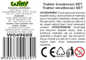 Traktor šroubovací nakladač s návěsem set. Rozměry s návěsem 40x13,5x12 cm. Obsah balení - traktor, návěs, sada nářadí na šroubovaní. Na setrvačník.