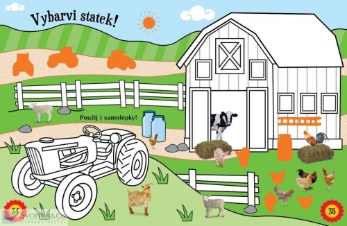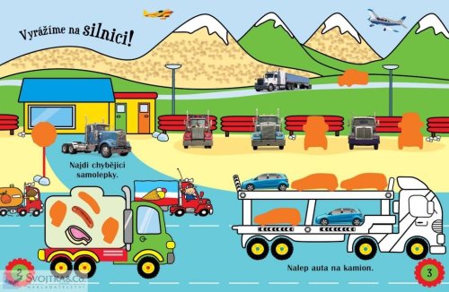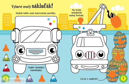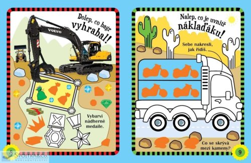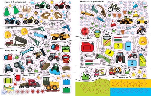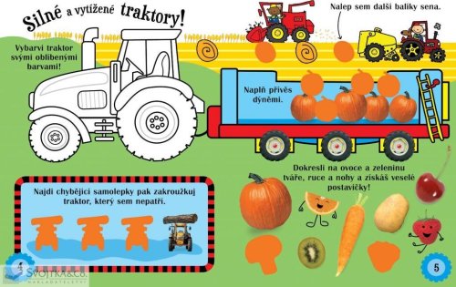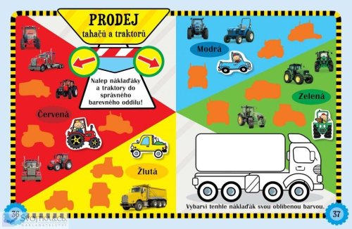 Milovníci traktorů a náklaďáků si s touto knihou užijí skvělou zábavu při spoustě činností spojených s vybarvováním a nalepováním 1000 samolepek. Nalep auta na převozní kamion anebo vybarvi traktor svými oblíbenými barvami. Co vyhrabal bagr? Dolep samolepky a uvidíš! Zjisti, který z traktorů dojede nejdříve do cíle! Najdi v kontejneru šest předmětů. Tyto a spousta dalších zábavných činností už na tebe čekají. Užij si skvělou zábavu s vybarvováním, doplňováním a nalepováním více než 1000 samolepek do této knížky plné traktorů a náklaďáků, které si můžeš nalepit buď přímo do knihy, nebo kamkoli budeš chtít!
