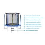 Skákací trampolína Marimex je trampolína s vnitřní ochrannou sítí. Při skákání se tedy neuhodíte o rámové obloukové sloupky trampolíny, které díky svému prohnutí zvětšují prostor mezi sítí a sloupkem samotným. Skákací plocha trampolíny Marimex s ochranou vůči UV záření je z vysoce kvalitního materiálu s hladkou protiskluzovou vrstvou a speciální úpravou, díky níž si při skákání neodřete kůži na nohou.