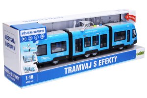 Tramvaj s efekty. Velikost 44 cm. Na setrvačník. Otevírací dveře. Světelné a zvukové efekty. 3xAG13 knoflíková baterie součástí. Efekty se aktivují 4 tlačítky na střeše tramvaje.