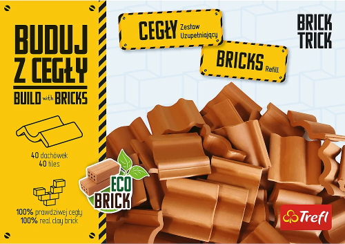 Potřebujete více cihel? Máte nápady na novou výstavbu? Doplňkové balení hliněných střešních tašek ke stavebnici Brick Trick - TREFL můžete využít pro dotváření vlastních staveb a přístaveb. Se stavebnicemi Brick Trick skládáte cihlu za cihlou, řežete a lepíte prkénka, postupujte od základů až po dokončenou budovu a nakonec svůj výtvor můžete ozdobit dekoracemi. Můžete stavět krok za krokem podle návodu nebo realizovat své vlastní řešení. Balení obsahuje 40 ks.