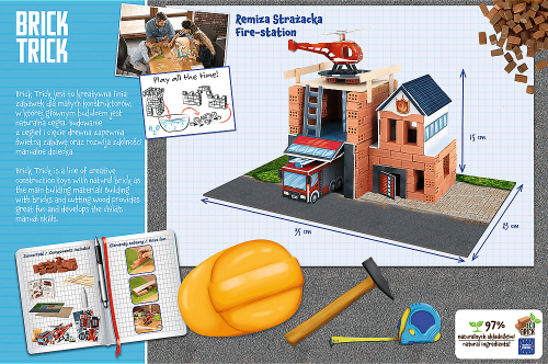 Staňte se stavitelem a vybudujte ze skutečných hliněných cihel a dřeva svoji vlastní hasičskou zbrojnici! Skládejte cihlu za cihlou, řežte a lepte prkénka, postupujte od základů až po dokončenou budovu a nakonec svůj výtvor ozdobte přiloženými dekoracemi. Stavte krok za krokem podle návodu nebo najděte a zrealizujte své vlastní řešení. Oživte svou dokončenou stavbu papírovými figurkami. Pokud spojíte několik sad TREFL Brick Trick, můžete vytvořit malebnou vesničku, moderní město nebo středověkou osadu. Stavebnici lze používat opakovaně (lepidlo je rozpustitelné vodou). Balení obsahuje: - více než 190 přírodních hliněných cihliček - dřevěná prkénka - lepidlo - dekorační doplňky - základovou desku - samolepku - obrázkový návod Stavebnice Brick Trick od výrobce TREFL zlepšují manuální dovednosti, rozvíjí představivost a podporují soustředění. Vhodné pro děti od 6 let. Vyrobeno v EU.