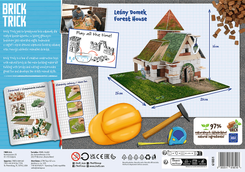 Postavte lesní domek ze skutečných cihel a dekorativních prvků. S produkty Brick Trick se seznámíte s některými populárními a oblíbenými památkami a hlavně získáte možnost postavit si je od základů. Skládejte cihlu za cihlou, řežte a lepte prkénka, postupujte od základů až po dokončenou budovu a nakonec svůj výtvor ozdobte přiloženými dekoracemi. Stavte krok za krokem podle návodu nebo najděte a zrealizujte své vlastní řešení. Oživte svou dokončenou stavbu papírovými figurkami. Pokud spojíte několik sad TREFL Brick Trick, můžete vytvořit malebnou vesničku, moderní město nebo středověkou osadu. Stavebnici lze používat opakovaně (lepidlo je rozpustitelné vodou). Úroveň obtížnosti: 3,5 Balení obsahuje: - více než 220 přírodních hliněných cihliček - dřevěné desky - základovou desku - ozdobné prvky - samolepku - lepidlo - obrázkový návod Stavebnice Brick Trick od výrobce TREFL zlepšují zručnost, rozvíjí představivost a podporují soustředění.