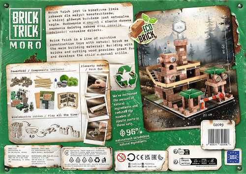 Staňte se stavitelem a vybudujte ze skutečných hliněných cihel a dřeva svoji vlastní vojenskou základnu! Skládejte cihlu za cihlou, řežte a lepte prkénka, postupujte od základů až po dokončenou budovu a nakonec svůj výtvor ozdobte přiloženými dekoracemi. Stavte krok za krokem podle návodu nebo najděte a zrealizujte své vlastní řešení. Oživte svou dokončenou stavbu papírovými figurkami. Pokud spojíte několik sad TREFL Brick Trick, můžete vytvořit malebnou vesničku, moderní město nebo středověkou osadu. Stavebnici lze používat opakovaně (lepidlo je rozpustitelné vodou). Balení obsahuje: - více než 340 přírodních hliněných cihliček - dřevěná prkénka - lepidlo - dekorační doplňky - základovou desku - obrázkový návod Stavebnice Brick Trick od výrobce TREFL zlepšují manuální dovednosti, rozvíjí představivost a podporují soustředění. Vhodné pro děti od 6 let. Vyrobeno v EU.