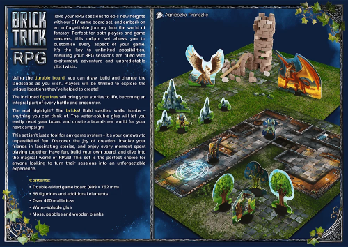 kreativní stavebnice pro hry na hrdiny (RPG), obsahuje skutečné cihly a vodou rozpustné lepidlo – možnost opakovaného stavění, umožňuje vytvářet hrady, ruiny, zdi, žaláře a další prostředí, figurky, monstra a dekorace pro pohlcující herní atmosféru, snadno kombinovatelné s dalšími RPG doplňky a figurkami, ideální pro tvorbu jedinečných bitevních map a scénářů, rozvíjí kreativitu, představivost a taktické myšlení hráčů, výrobek přináší realistické prostředí do každé RPG hry, variabilní stavby umožňují pokaždé jiné dobrodružství, vhodné pro skupinovou hru i sólovou přípravu her.