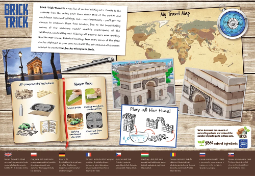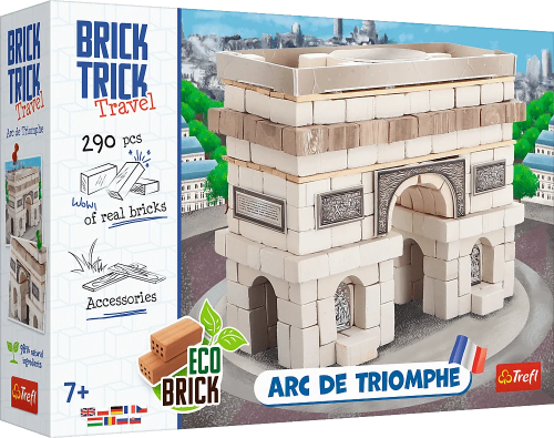 Postavte symbol Paříže - Vítězný oblouk ze skutečných cihel a dekorativních prvků. S produkty z řady Brick Trick Travel se seznámíte s některými populárními a oblíbenými památkami a hlavně získáte možnost postavit si je od základů. Skládejte cihlu za cihlou, řežte a lepte prkénka, postupujte od základů až po dokončenou budovu a nakonec svůj výtvor ozdobte přiloženými dekoracemi. Stavte krok za krokem podle návodu nebo najděte a zrealizujte své vlastní řešení. Oživte svou dokončenou stavbu papírovými figurkami. Pokud spojíte několik sad TREFL Brick Trick, můžete vytvořit malebnou vesničku, moderní město nebo středověkou osadu. Stavebnici lze používat opakovaně (lepidlo je rozpustitelné vodou). Úroveň obtížnosti: 4,5 Balení obsahuje: - více než 290 přírodních hliněných cihliček - dřevěné desky - základovou desku - ozdobné prvky - samolepku - lepidlo - obrázkový návod Stavebnice Brick Trick od výrobce TREFL zlepšují zručnost, rozvíjí představivost a podporují soustředění.