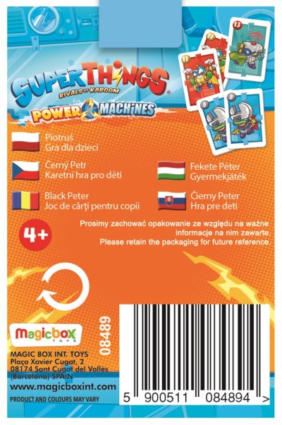 Dětská karetní hra Černý Petr s obrázky animované party Super Things. Všech 25 karet se rozdá zúčastněným hráčům tak, aby nebylo vidět, kdo Černého Petra dostal. Následně hráči odloží stejné dvojice karet na stůl (podložku) a zbývající karty si rozloží v ruce. Hráči si nabízí karty v kruhu a tvoří stejné dvojice. Prohraje ten, komu zůstane v ruce Černý Petr. Balení: 25 karet v papírové krabičce