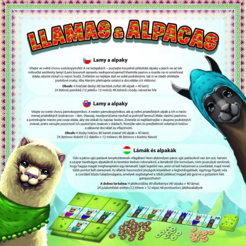Vítejte na horských pastvinách obývaných lamami a alpakami! Ve hře rozmístěte na hrací plochu postupně karty zvířat tak, abyste měli vedle sebe 3 zvířata, která mají společnou vlastnost - druh zvířete, číslo na kartě nebo barvu doplňků. Hledejte podobnosti! Čím více společných znaků, tím více bodů, které vás přiblíží k výhře. Objevte hru Lamy a alpaky, která podpoří zábavu malých i velkých milovníků zábavy! Tato desková hra plná jedinečné grafiky vám poskytne nezapomenutelné chvíle s rodinou a přáteli a zároveň rozvíjí strategické myšlení a počítání. Je ideální pro 2 až 4 hráče a průměrná herní doba se bude pohybovat kolem 20 minut. Jste připraveni? Připravte se na nezapomenutelná dobrodružství! Jak se hraje? Každý hráč dostane herní desku, na kterou musí rozmístit karty lam a alpak tak, aby získal co nejvíce bodů za řady zvířat, které nasbíral. Každý hráč dává pozor na to, zda se v nasbíraných stádech zvířat vyskytují společné znaky, aby se nasbírané body znásobily. To vše se děje proto, aby se na cestě k vítězství dostal před ostatní hráče. Rozměr balení: 20 x 20 x 6 cm Vhodné pro děti od 6 let