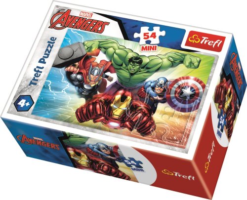 Mini-Puzzle (dílky 2,2 cm, baleno v malé krabičce) ze série Avengers. Rozměr složeného puzzle cca 20 x 13 cm