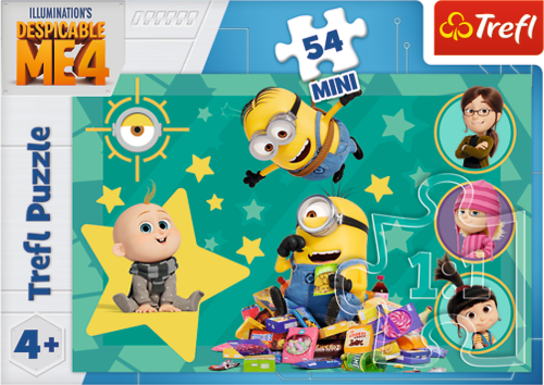 Mini-Puzzle (dílky 2,2 cm, baleno v malé krabičce) z animáku Já, padouch 4. Rozměr složeného puzzle cca 20 x 13 cm