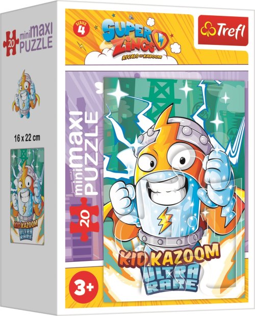 Mini maxi Puzzle (dílky 4,2 cm, baleno v malé krabičce) ze série Kid Kazoom a Super Zings. Rozměr složeného puzzle cca 16 x 22 cm