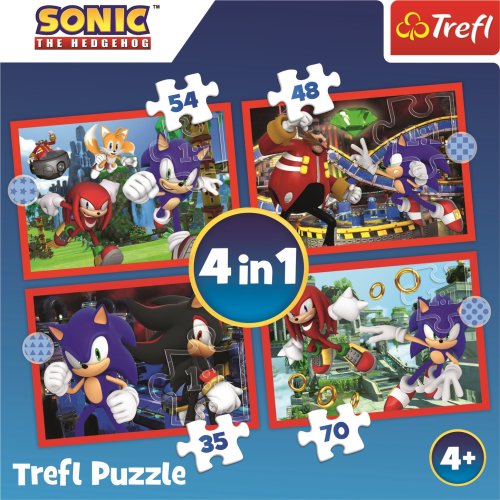Dětské puzzle TREFL s motivem animovaného filmu Sonic. Progresivní puzzle s různou obtížností - 4 puzzle s 35 - 70 dílky. Rozměr složeného puzzle cca 28,5 x 20,5 cm