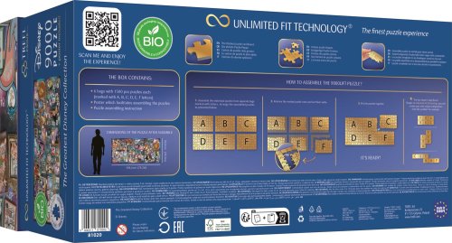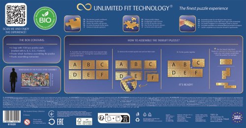 Nejvyšší kvalita - puzzle je vyrobeno z nejsilnějšího modrého kartonového podkladu. Unikátní technologie UFT umožňuje vytvoření vlastní kompozice. Puzzle dílky drží u sebe - poskládané obrázky je možné pohodlně přemisťovat, aniž by se složený motiv rozsypal. Bio balení - bez svrchní plastové folie. Vnitřní sáček je zcela biologicky rozložitelný a kompostovatelný. Puzzle je baleno v šesti samostatných sáčcích po 1500 dílcích. Součástí balení je i papírová předloha o rozměru 67x45cm.