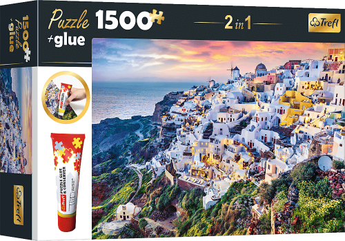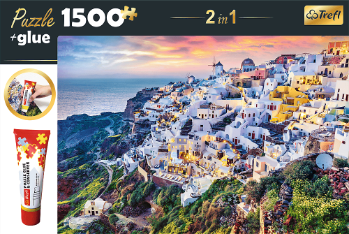 Sada 2v1: puzzle + lepidlo. Tekuté lepidlo na vodní bázi s aplikátorem trvale slepí až čtyři tisíce poskládaných dílků puzzle. Nanáší se přímo na obrázek pěnovou houbičkou, která je umístěna pod uzávěrem (uzávěr je nutné sejmout, nikoliv odšroubovat). Lepidlo vystačí orientačně na 1,5m², což odpovídá 4000 dílků. Objem 70 ml. Návod k použití lepidla: Položte puzzle na rovný a pevný povrch. Přitiskněte houbičku na horní (obrázkovou) stranu složeného puzzle a aniž byste ji zvedali, rovnoměrně nanášejte lepidlo na celou plochu. Aplikátor po použití opláchněte vodou a puzzle nechte zaschnout. Rozměr složeného puzzle cca 85 x 58 cm