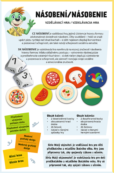 Procvičování násobení – ideální vzdělávací hra pro děti, které se zdokonalují v násobení. Spojení hry s edukací – hravá forma učení podporuje logické myšlení a rozvoj matematických dovedností. Vhodné pro předškoláky – série Malý objevitel je speciálně navržena pro děti od 3 let, které se připravují na školu. Spojení zábavy a učení – děti si hrají a přitom přirozeně rozvíjejí vnímání, soustředění i postřeh. Skvělý tip na dárek – vzdělávací hra, která potěší děti i rodiče díky hravému učení.