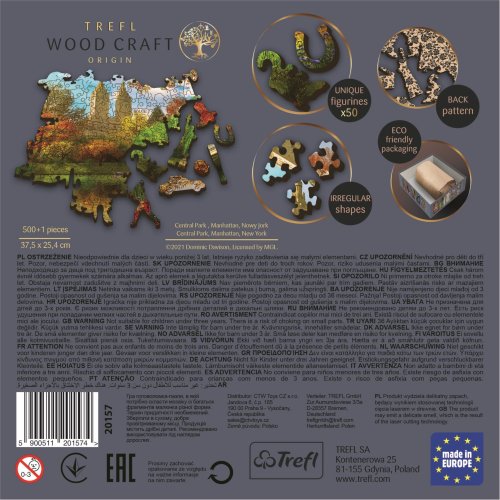 vysoká kvalita a precizní zpracování laserem až 50 unikátně tvarovaných dílků ve tvaru budov, předmětů a zvířat ostatní dílky v nepravidelných tvarech puzzle je oboustranné - z jedné strany obrázek, z druhé strany vzor ekologické balení - zcela bez plastových obalů