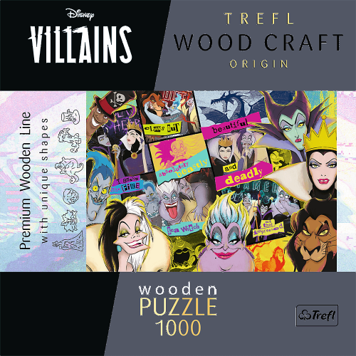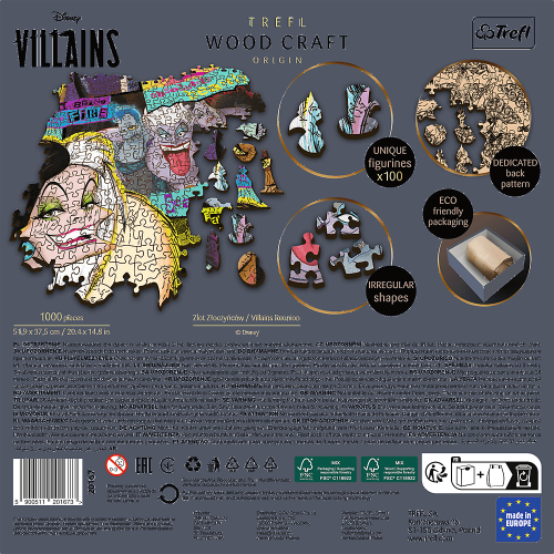 Dřevěné oboustranné puzzle TREFL z prémiové řady Wood Craft Origin se speciálně tvarovanými dílky, které jsou inspirované světem Disney. Puzzle je vyrobeno ze silné dřevovláknité desky a vyřezáno laserem, díky čemuž jsou okraje hladké a dílky do sebe lehce zapadají.