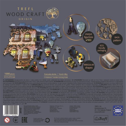 Dřevěné oboustranné puzzle TREFL z prémiové řady Wood Craft Origin se speciálně tvarovanými dílky ve tvaru slavných budov, dopravních prostředků nebo třeba zvířat. Puzzle je vyrobeno ze silné dřevovláknité desky a vyřezáno laserem, díky čemuž jsou okraje hladké a dílky do sebe lehce zapadají. - vysoká kvalita a precizní zpracování laserem - 100 unikátně tvarovaných dílků ve tvaru budov, předmětů a zvířat - ostatní dílky v nepravidelných tvarech - puzzle je oboustranné - z jedné strany obrázek, z druhé strany vzor - ekologické balení - zcela bez plastových obalů Součástí balení je předloha skládaného motivu.