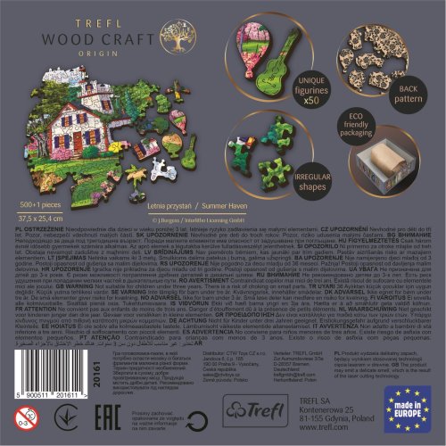 vysoká kvalita a precizní zpracování laserem až 50 unikátně tvarovaných dílků ve tvaru budov, předmětů a zvířat ostatní dílky v nepravidelných tvarech puzzle je oboustranné - z jedné strany obrázek, z druhé strany vzor ekologické balení - zcela bez plastových obalů